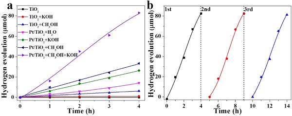 b) Pt/TiO2(001)在含有甲醇的0.1 mol·L-1 KOH溶液中的制氢稳定性实验。