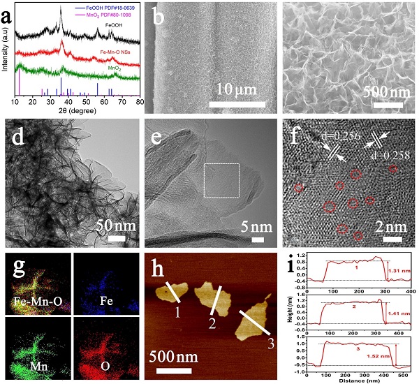 h, i) Fe-Mn-O NSs的AFM图及相应的高度曲线。