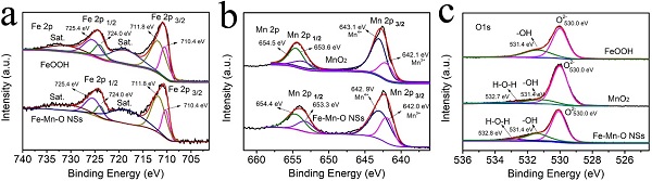 a) FeOOH和Fe-Mn-O NSs的Fe 2p XPS谱;