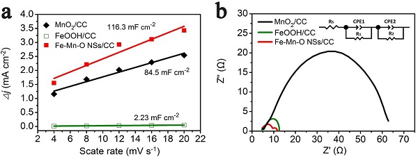 a) 在1 M KOH中,FeOOH/CC、MnO2/CC和Fe-Mn-O NSs/CC的电流密度随扫速的变化图;