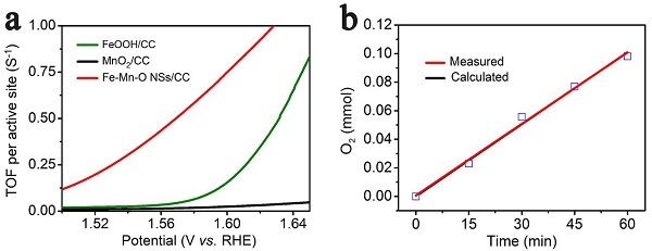 综上所述,作者利用一种简单的回流和低温煅烧策略制备了一种原子尺度薄的富缺陷Fe-Mn-O杂化纳米片电极,与单独的MnO2和FeOOH电极相比,其OER催化性能得到了明显提高。起峰电位能够低至1.46 V, Tafel斜率仅为63.9 mV·dec-1,并且达到10 mA·cm-2的电流密度只需273 mV的过电位。另外,它还具有良好的催化稳定性和较高的TOF值 (1.02 s-1,η= 400 mV)。由详细的电化学表征和催化机理分析可知,优异的OER性能主要可归因于超薄纳米片结构,其厚度仅约1.4 nm,可暴露大量催化活性位点并能够与电解质溶液形成有效的接触。复合纳米片中丰富的缺陷结构以及Fe、Mn和O元素在原子尺度内的协同作用能够有助于改善其本征催化活性。此外,Fe-Mn-O杂化纳米片在碳布基底上的原位生长也确保了良好的电接触和电荷传输能力。该项研究工作通过一种简单温和的合成方法制得了一种富缺陷的2D超薄纳米片,为开发高效的OER催化剂材料提供了新的思路。