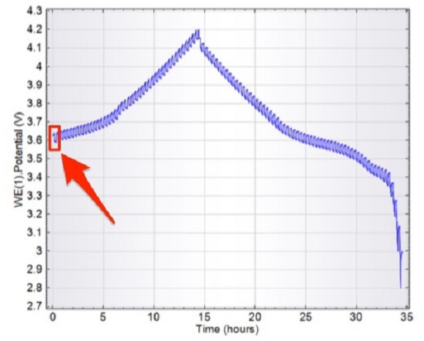 首先,从OCP(开路电位)开始充电。瞬时提升0.02V的电位,保持15分钟,随后撤去电位激励,进行15分钟的放松时间。每次施加0.02V的电位增量,依次重复这个循环,直到达到4.2V的上限。之后进入放电阶段,每次减少0.02V,其余设置与充电环节类似。