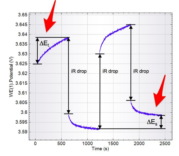 接着,中断充电电流,电势迅速下降,下降的值与iR降成正比。最后,进入弛豫过程。在此豫期间,通过锂离子扩散,电极中的组分趋向于均匀,电势缓慢下降,直到再次平衡。