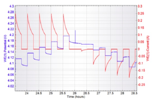 图1. 商用锂离子电池的GITT测试结果(Autolab Application Note BAT03)