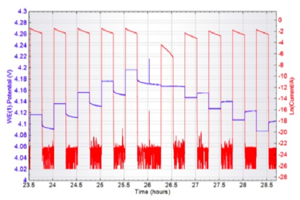 图7. PITT测试中电势(蓝)、电流(红)与时间的关系,4.2V电位左右放大图[3]