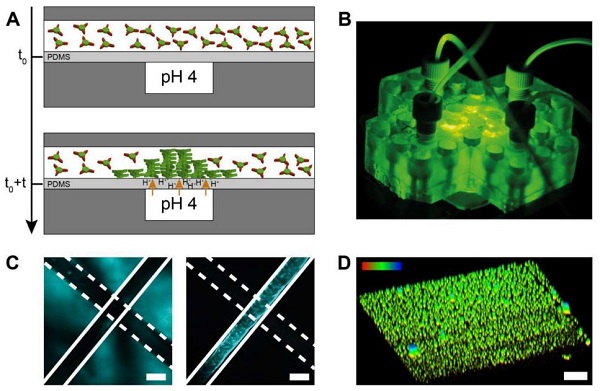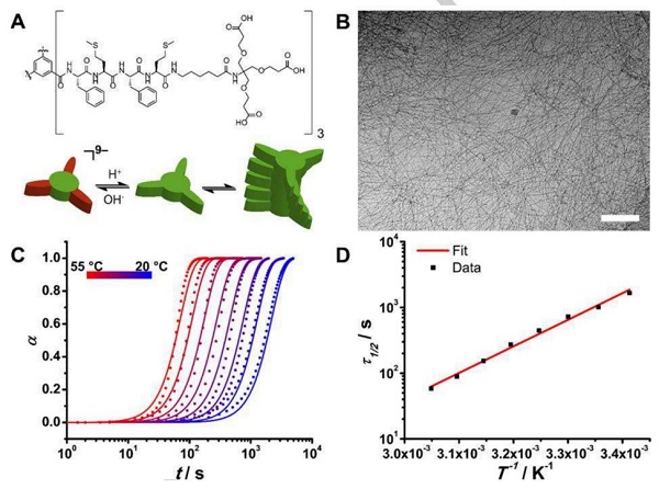 在这个工作中,作者报导了一种树枝状的1,3,5-三甲酰胺苯多肽结合物。这种结合物在pH的诱导下进行组装。动力学模型为其在溶液中的成核、伸长和断裂行为提供了一定的理论基础。作者利用从本体的质子扩散在固液界面实现了这个分子的组装。这种表面辅助的自组装方法被用到其他凝胶上,可以被用来创造规整的超分子材料。