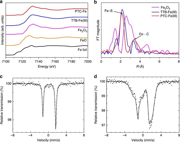 (b): PTC-Fe及其对比样品Fe2O3和TTB-Fe中Fe K边缘处的EXAFS傅里叶变换光谱;