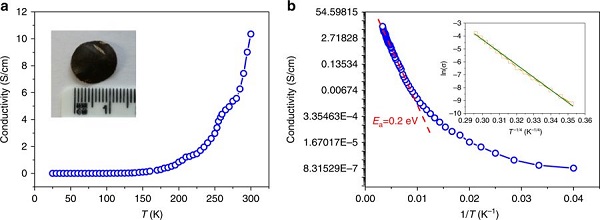 (a): 电导率(σ)与温度关系曲线;插图:压片样品图。