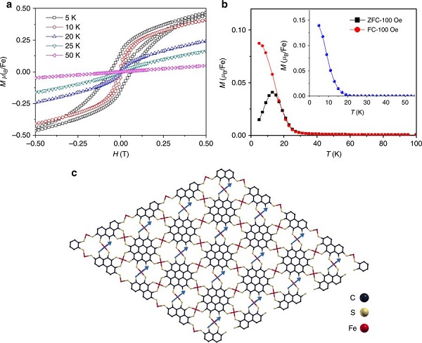 近日,来自德国德累斯顿工业大学的冯新亮教授(通讯作者)和董人豪博士(第一作者)等在Nat. Commun.上发表了题为A coronene-based semiconducting two-dimensional metal-organic framework with ferromagnetic behavior的文章,该团队采用溶剂热法使用全硫醇化的六苯并苯(perthiolated coronene, PTC)作为配体与铁盐络合,合成具有层堆叠结构的六方有序的二维MOF材料(PTC-Fe)。由于大π平面分子和四方平面FeS4节点的结合,该2D MOF表现出高度的π-d共轭和电子全离域化。范德堡四点测量法(van der Pauw method)表明该2D MOF在300 K时具有~10 S cm-1的高导电率,并表现出典型的半导体性质。理论计算(DFT method)表明单层的PTC-Fe具有~0.2 eV的带隙。变温磁化率和57Fe穆斯堡尔谱测量证明了PTC-Fe中纳米磁性团簇在20 K以下的铁磁性演变。这一铁磁行为是由于Fe中心自旋电子通过离域π电子的间接交换相互作用发生耦合而导致。他们的结果表明,共轭2D MOF具有作为新一代铁磁半导体的潜力,在自旋电子学应用中具有诱人的前景。