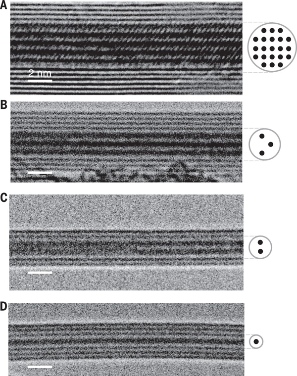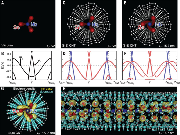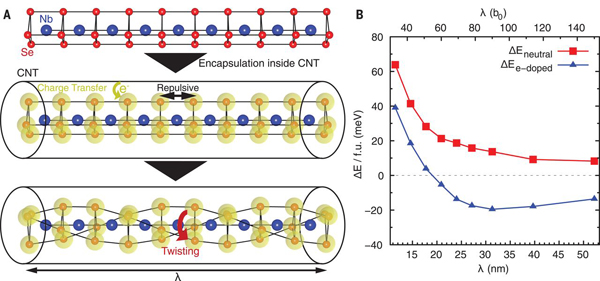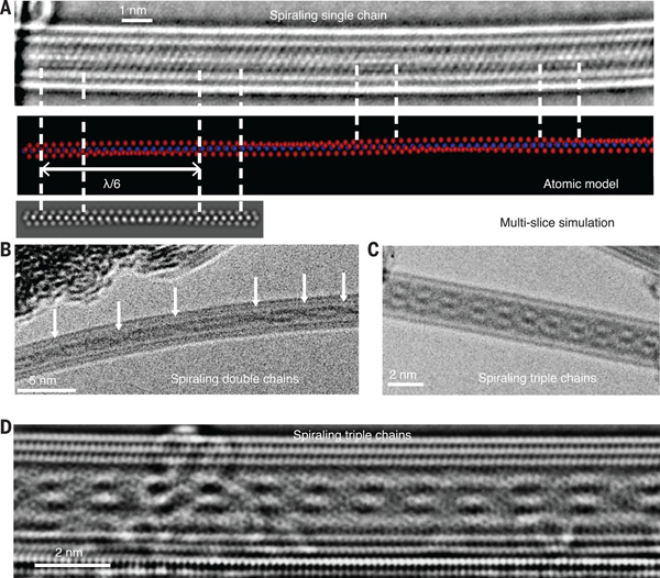 今日,在美国加州大学伯克利分校 、劳伦斯伯克利国家实验室Alex Zettl教授(通讯作者)的带领下,与分子铸造和人工光合作用联合中心合作,报道了在一个链限制内的一维过渡金属三硫族化物NbSe3的合成,包括实现分离的单链,链被包封在保护性氮化硼纳米管(BNNT)或碳纳米管(CNT)外壳中。空间限制促进并稳定亚晶胞NbSe3的生长,直至三重,双重甚至单原子链。封装还可以保护链条免受环境氧化,并且易于处理和表征。链条在管内可移动。即使在单链限制下,也观察到具有规则周期性的不寻常的螺旋扭转波。电子结构理论计算表明NbSe3的电子能带结构高度依赖于链数和方向,扭转波的不稳定性是由链的充电驱动的。在链和纳米管鞘之间发现非常少的共价键合,导致包封链的相对不受阻碍的纵向和扭转动力学。相关成果以题为“Torsional instability in the single-chain limit of a transition metal trichalcogenide”发表在了Science上。
