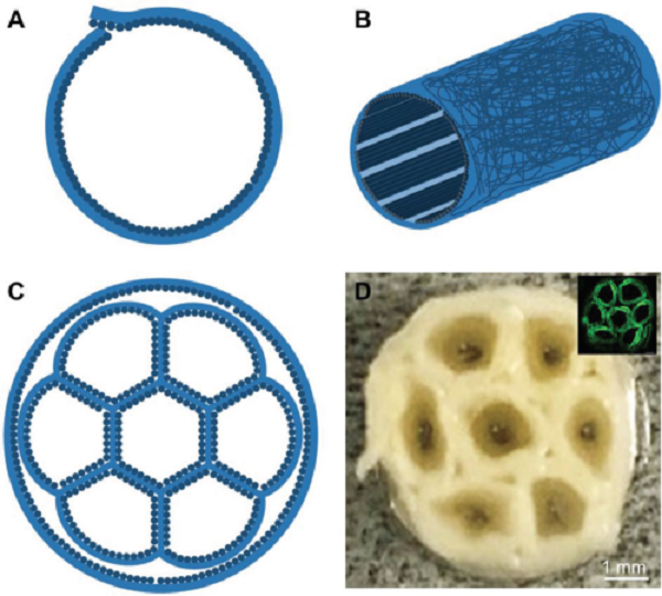 最近夏幼南教授课题组开发出一种蜂巢状多管道纳米纤维导管,并将其应用于末梢神经的修复。该导管的设计模仿了末梢神经结构,作者先用无序纳米纤维膜将定向排列的有序纳米纤维膜包裹卷成管状,然后将七个这样的管道包裹进一根大管道的内腔,形成蜂巢状多管道导管(图1)。在管壁之间导入粘合剂之后,该管道的强度和韧性能够达到外科手术操作的标准。