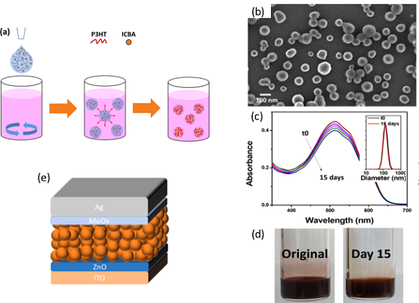 图2.P3HT/ICBA纳米粒子墨水((a)-(d))及有机光伏器件(e)