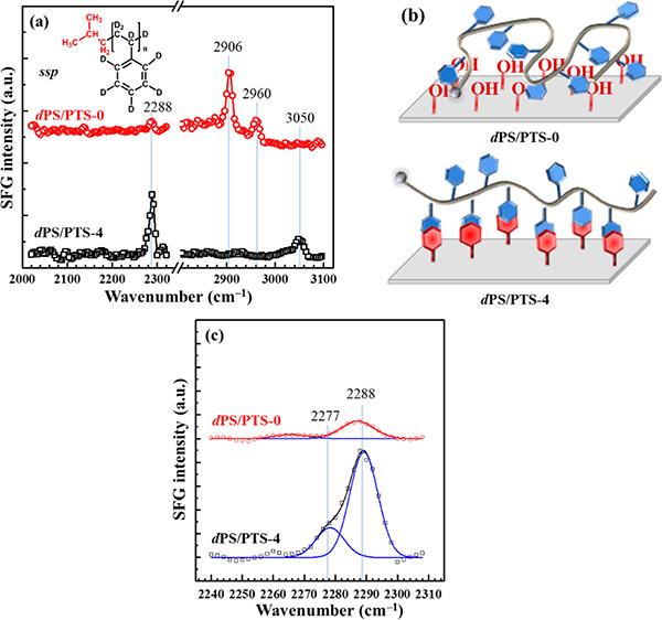 (a) 未修饰和修饰PTS基底上吸附氘代聚苯乙烯的SFG谱图;