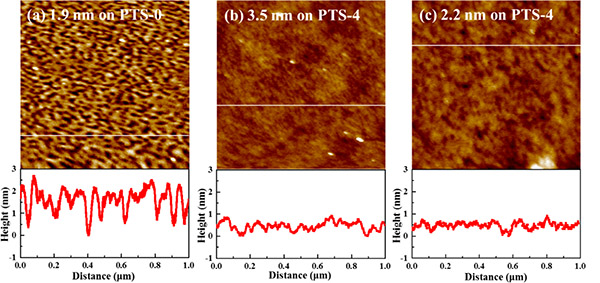 (a) PTS-0基底上1.9纳米厚度吸附层的AFM图像;