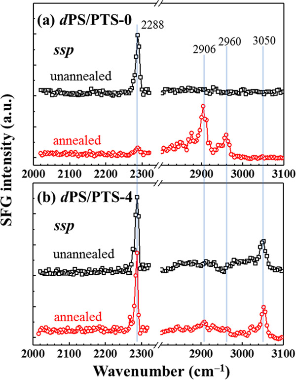 (b) PTS-0和PTS-4基底上氘代聚苯乙烯吸附层在有无433K热处理48小时条件下的的SFG ssp谱图。