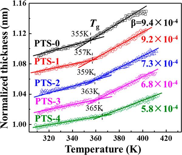 图6 PTS修饰基底上聚苯乙烯薄膜的热膨胀行为