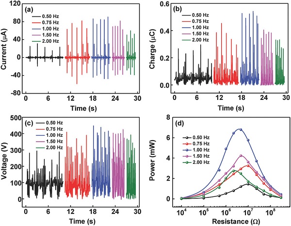 在不同水波频率下,含五个基本单元的球形发电机的a)输出电流,b)转移电荷,c)输出电压,d)输出功率。