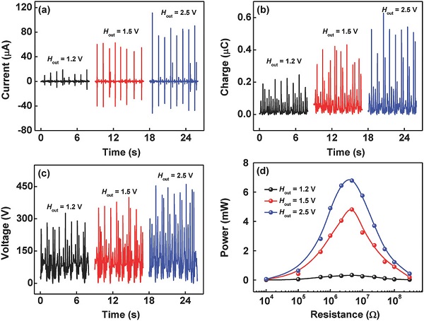 在不同水波振幅(信号发生器的输出电压幅值)下,含五个基本单元的球形发电机的a)输出电流,b)转移电荷,c)输出电压,d)输出功率。