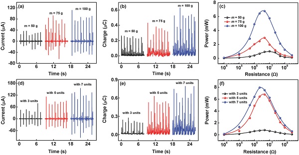 铜块质量对含五个基本单元的球形发电机的a)输出电流,b)转移电荷,c)输出功率的影响;多层结构中发电单元的集成数目对球形发电机的d)输出电流,e)转移电荷,f)输出功率的影响。