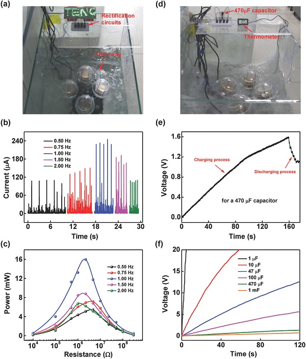 b) TENG阵列的整流输出电流和c )在不同水波频率下输出功率与电阻的关系;