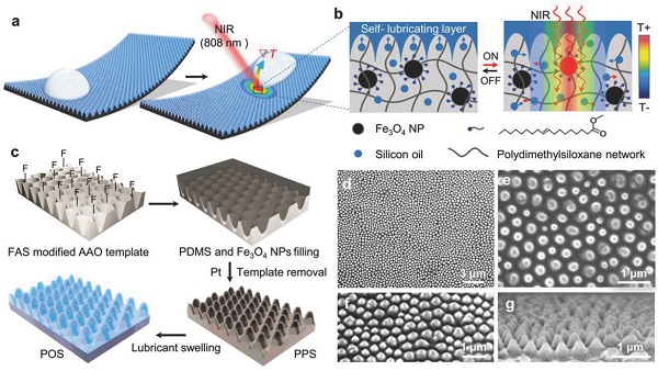 在这个工作中,作者利用润滑油浸润的方法将Fe3O4纳米粒子嵌入聚二甲基硅氧烷中制备了光响应的有机凝胶表面。通过近红外光辐射的触发,被辐射的有机凝胶表面会迅速产生局部动态温度梯度来实现液滴传输。这种有机凝胶表面可实现包括水、乙二醇、丙二醇在内的等多种液滴的传输。