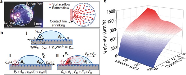 (c).液滴体积和POS中的Fe3O4纳米粒子的含量对液滴移动速度的影响