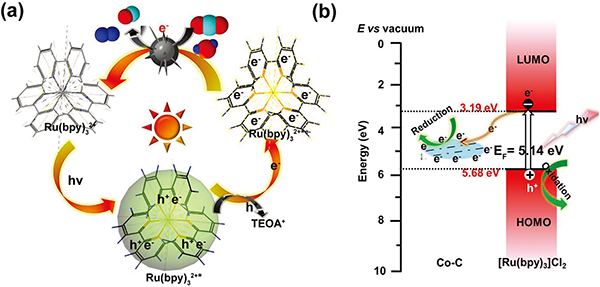 (b)能级的示意图,显示从Ru(bpy)3 2+到PMMCoCC-1200的电子转移。 EF:费米水平; LUMO:最低未占分子轨道; HOMO:最高占据分子轨道