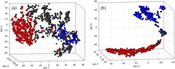 基于由DBSCAN识别的集群数据标记的3D表示,(a)对应于BTO-BaM体系,(b)对应于BTO-CFO体系(灰色:集群-1,红色:集群-2,蓝色:集群-3)。
