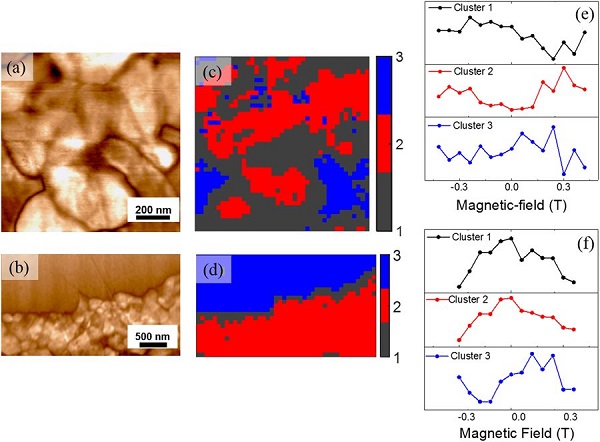 该研究通过使用PCA和DBSCAN进行组合分析,使得能够从可变磁场PFM数据集中获取物理意义。同时,利用有效的实验论证,他们强调了序列成像数据集固有的“小数据”问题。利用t-SNE获得了3D数据表示,从而得到了数据点的变化分布,突出了数据向量的稀疏性质。同时,使用DBSCAN有效地聚集了数据点。两个体系的标记数据结构清楚地表现出了对应于铁电相、磁相和界面的数据点,他们提出,两个系统的数据结构之间的关键差异在于它们的二次扩散。尽管存在个体复杂性,但两种数据集都通过PCA进行了最佳分析。从而得出结论,建议利用二阶非中心矩为此类数据集提供最优的特征提取。作为一般的物理结论,他们注意到与基于尖晶石-铁氧体的复合材料相比,基于六角铁氧体的复合材料中局部观察到的ME效应较弱。这种差异可能与此有关:在六角铁氧体中,每个微晶的可能易轴的数量(磁致伸缩最高)被限制为2,而在尖晶石-铁氧体的情况下有4个这样的可能轴,导致了更多界面处的均匀应力分布。