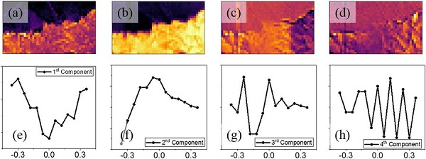 (e-h)为前四个主成分及其相应的得分图(a-d),该分数图源于体系-2的数据矩阵(明暗对比分别对应高分和低分)。