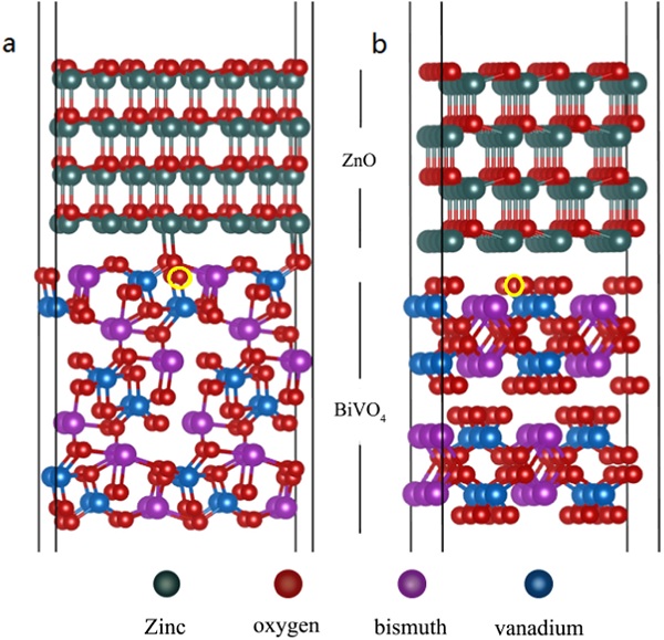 a) ZnO负载在BiVO4{110}晶面原子结构示意图,其中黄色圆圈代表氧空位位点(下同);