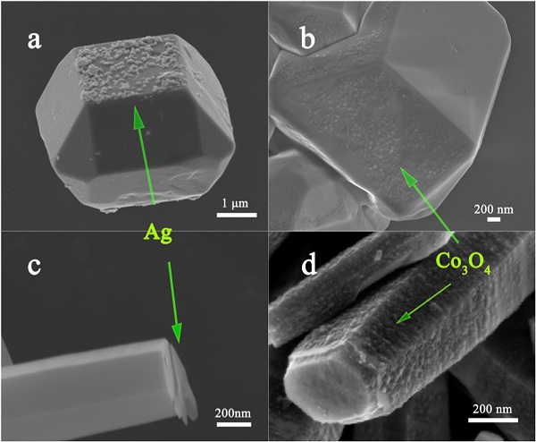 d) 光沉积Co3O4在ZnO纳米棒表面的SEM图像。