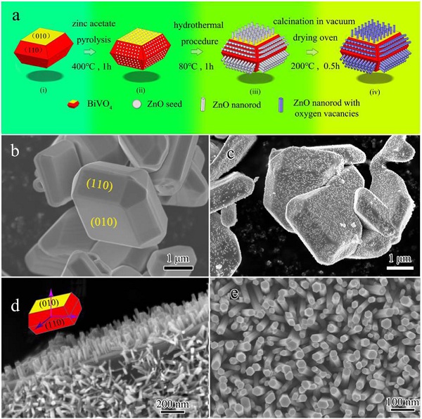 a) ZnO纳米棒负载在BiVO4表面制备过程示意图;