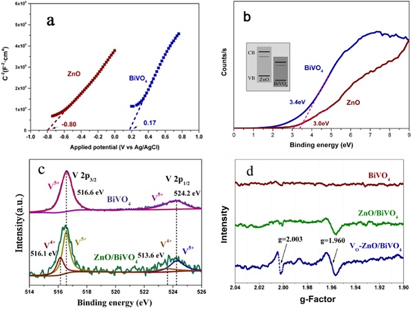 a) BiVO4和ZnO的Mott-Schottky曲线;