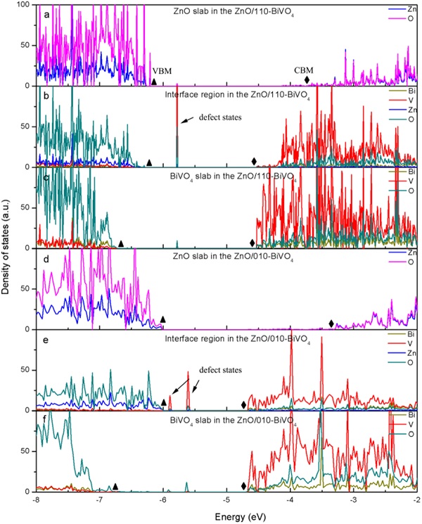 a-f)有氧空位的ZnO/BiVO4异质结态密度计算和缺陷能态的分布。