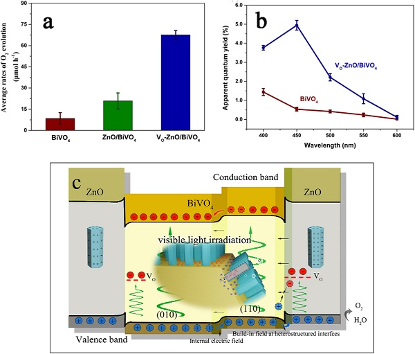 b) BiVO4和Vo-ZnO/BiVO4不同波长的AQY;