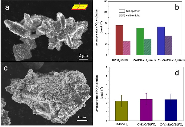 b) BiVO4纳米片和其复合结构在全光谱和可见光照射下的光解水产氧活性测试;