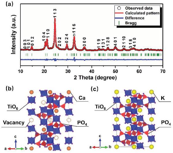 a) Ca0.5Ti2(PO4)3的XRD图谱精修;