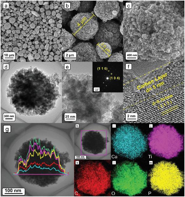 d,e) 多级结构CTP@C微球的TEM图像,e图内插为SAED图像;