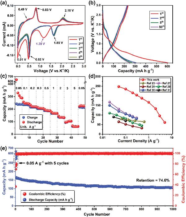 由于钾资源储量丰富、成本低廉,钾基电化学储能技术具有良好的应用前景。值得注意的是,K+/K的氧化还原电位(相对于标准氢电极为-2.92 V)低于Na+/Na的氧化还原电位(-2.71V),使得钾基储能装置具有更高的工作电压。然而,K+较大的离子半径(1.38 Å)会导致材料在循环过程中发生严重的体积膨胀,且K+在嵌入脱出过程中的动力学过程缓慢。为了解决以上问题,人们通常选用具有框架结构或者层状结构的化合物作为高性能钾基储能装置的电极材料,例如普鲁士蓝类似物及层状KxMO2(M为过渡金属离子)等。近年来,钠超离子导体(NASICON)结构化合物在储能领域受到了广泛关注。其稳定的三维框架结构不仅有助于离子的快速传输,并且在离子嵌入/脱出过程中表现出可控的体积变化,因此表现出优异的储钾性能。然而,目前仅有极少数的NASICON结构化合物作为电极材料应用于钾基储能装置中。