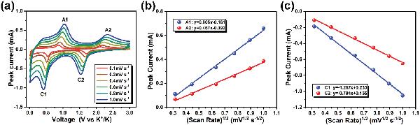 b,c) 峰电流(Ip)与扫速平方根(v1/2)的线性关系及其线性拟合。