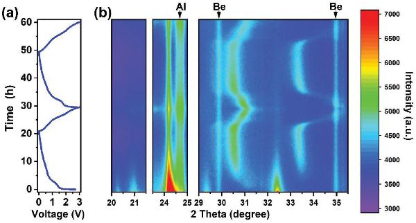 b) 多级结构CTP@C微球的首圈和次圈充-放电过程中原位X射线衍射数据等高线图。