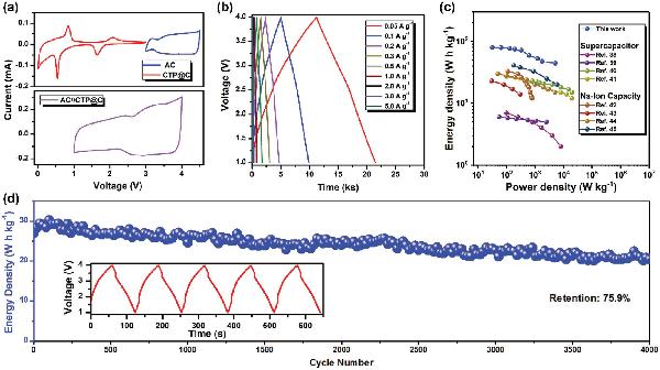 a) 多级结构CTP@C微球、AC半池(上)以及二者组装的钾离子电容器(下)的第2圈CV曲线;