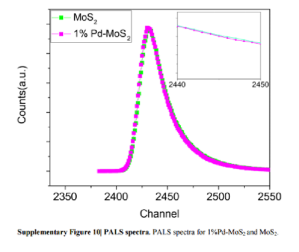 近日的Nature Communications 文章中(NAT. COMMUN., 2018, 9, 2120)报道了钯掺杂的二硫化钼材料的研究。研究中利用该技术对掺杂后产生的缺陷进行表征,如图所示。 研究者发现在MoS2材料掺杂1%的钯后,其晶格缺陷的弛豫时间τ1和空位缺陷的弛豫时间τ2显著延长。其中τ1 从183.6s 延长至206.2s,而τ2则从355.5s 延长至384.6s。这些弛豫时间的提高标志着缺陷维度的提升。此外,弛豫时间的强度也有所提升,意味着材料在掺杂后缺陷的含量明显高于未掺杂的二硫化钼材料。