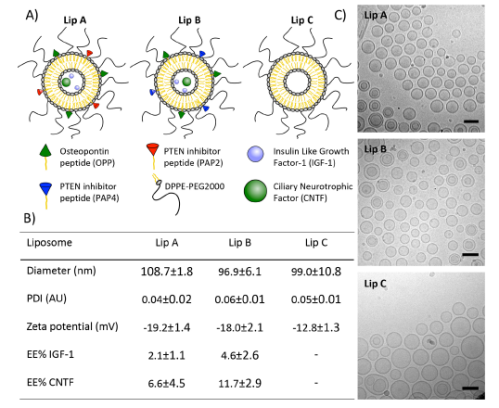 近日,丹麦技术大学的 Andrew J. Urquhart课题组构建了一种负载多种刺激mTOR通路的生物制剂的脂质体,旨在增强视网膜损伤后的神经保护作用。该研究发表于ACS Nano (DOI: 10.1021/acsnano.8b00596)。该研究中,脂质体负载有睫状神经营养因子,胰岛素样生长因子1,脂肽N-片段骨桥蛋白模拟物,以及用于ATP结构域或c-末端尾部的脂肽磷酸酶张力同源物抑制剂。装载有多种细胞途径调节剂的脂质体,具有将调节剂同时递送至细胞微环境的优点,促进对单细胞或多细胞途径的协同作用。此外,只需要非常低的浓度的信号通路调节剂通常就能达到非常有效治疗效果。这减少了对高分子药物负载的需要,并且最大化可用于将一系列治疗性小分子:肽和蛋白质包装到脂质体中的空间。