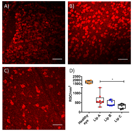 为了评估单次玻璃体内注射三种载药脂质体对NMDA诱导RGC死亡后宿主RGC存活的影响,作者对视网膜整体支架进行了RBPMS染色并在共聚焦显微镜上成像(图4 A B C)。通过计算图中RGC细胞存活数量与健康组进行对照(图4 D),显示Lip C不具有神经保护作用,Lip A或Lip B治疗不能完全防止RGC损伤。