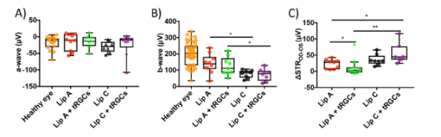 图5. 经过载药脂质体和移植RGC(tRGC)治疗的暗适应小鼠的视网膜电图振幅值。