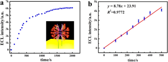 图三 (a) ECL对运动的监测时间函数。(b) ECL测定三维 DNA机器初始运动速度。