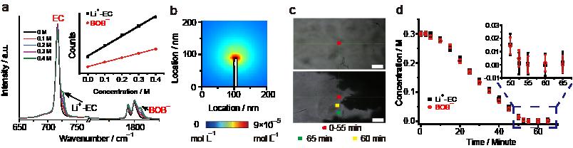 (d): 用普通拉曼显微镜探测Li+和BOB–的浓度随时间和位置的变化而一起变化,其阴阳离子浓度差小于2 mM,且在仪器误差范围内(8.3mM)。在普通拉曼中对每个点的单次测量需要积分14秒