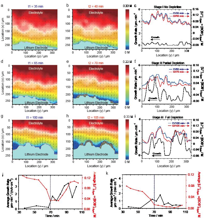 在三个代表性时刻(t1/t2),a-c:35/40分钟(阶段I /无耗尽),d-f:65/70分钟(阶段II /部分耗尽)和g-i:100/105分钟(阶段III /完全耗尽)。第一列在t1处显示离子浓度分布和固体锂电极区域。第二列在t2处显示[Li+]和锂电极区域,底部的灰色区域表示t1和t2之间的新沉积生成的金属锂。白色箭头表示枝晶生长方向和速率。第三列(c,f,i)显示枝晶生长速率(黑线)和[Li+]10µm与t1(蓝线)和t2(红线)处的位置之间的关系。(j-k): 反馈效应。两个区域(枝晶生长区和非枝晶生长区)中Li生长速率与距电极表面10微米出的锂离子浓度([Li+]10µm)之间的关系。枝晶生长区(j)表面离子浓度越来越高,锂沉积越来越快,而非枝晶生长区(k)离子浓度则越来越低,锂沉积则越来越慢。